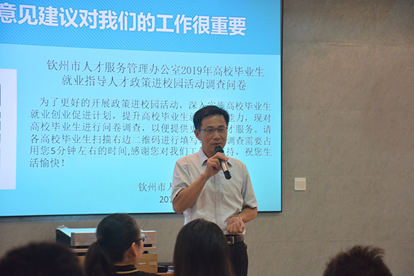 叶绍凡处长最后总结时说道:从当地政府的角度看,钦州市政府希望本地人才能够服务地方;从学校的角度看,学校为地方培养人才是学校应尽的义务。希望我校学生多了解当地情况,找到适合自己的工作岗位,毕业后生活在钦州、扎根在钦州。