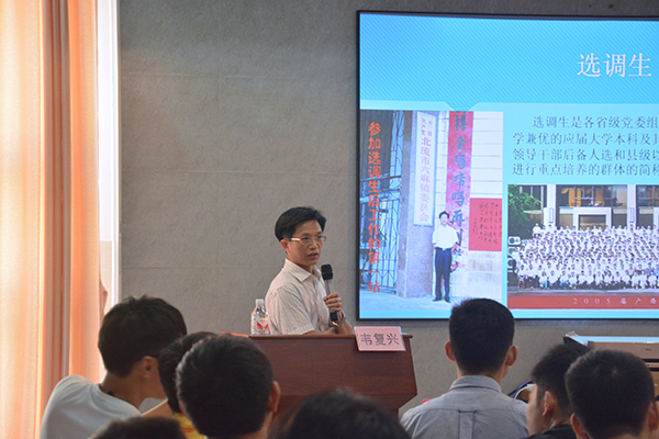 韦科长向大家介绍了钦州的发展现状、当前钦州就业形势、留在钦州就业的路径选择。他还着重在招聘资格、工薪待遇方面详细向大家介绍了五个服务基层的项目,包括选聘高校毕业生到村任职工作、党建工作组织员、农村义务教育阶段学校教师特设岗位计划、“三支一扶”计划、大学生志愿服务西部计划。韦科长还和在场的同学分享了扎根钦州的北部湾大学校友工作经历,并针对学生提出的问题进行解答。