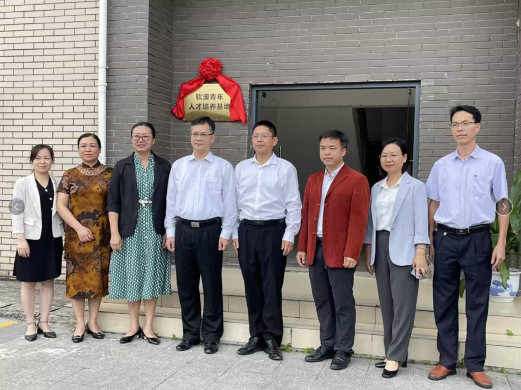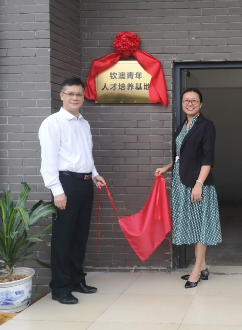 张轻副部长(左)、冯丽院长(右)共同为钦澳青年人才培养基地揭牌