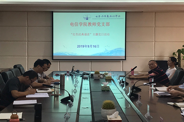 9月16日,电信学院教师党支部庆国庆“红色经典诵读”主题党日活动在5栋419会议室举行。电信学院党委书记卓杰先,党委副书记李贤阳(兼教师支部书记)以及党支部的全体党员参加了活动。此次主题党日活动由李贤阳副书记主持。