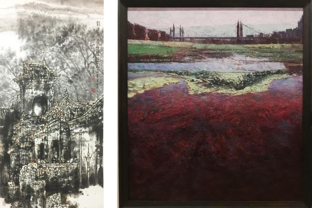 闭宗庭中国画作品《龙王庙白浮泉遗址》与张泽佳油画作品《滨河印象》