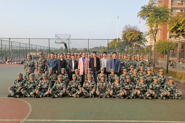 学院领导、老师与2019级军训的新生、教官合影留念